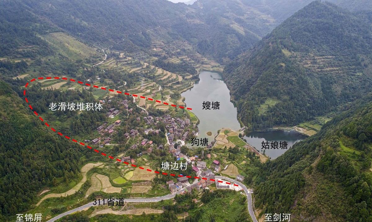 據(jù)悉,兩處老滑坡形成的堰塞湖分別是“雷打塘”和“崩坡塘”,兩塘北東-南西直線距離約66公里。雷打塘位于貴州省劍河縣南加鎮(zhèn)北東約4公里處,大、中、小三塘分別是嫂塘、姑娘塘和狗塘,漲水時(shí)三塘聯(lián)成一片,枯水季又各自成塘,景觀奇特。其中嫂塘最大,長約900米、最寬處215米,姑娘塘長約185米、最寬135米,三塘水域面積0.143平方公里(214.5畝),水域周長2.65公里。雷打塘是貴州境內(nèi)第二大天然湖泊。