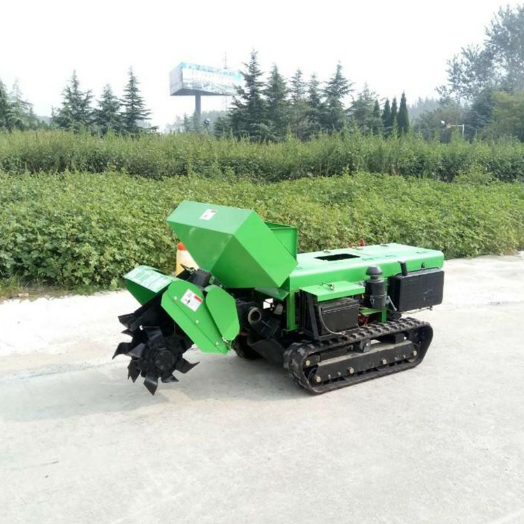 履帶式果園開溝機視頻 全自動果園施肥機 自走式果園開溝施肥機生態果園開溝施肥機 機械化管理開溝機果樹開溝施肥機價格果樹開溝施肥機廠家葡萄開溝施肥機 開溝機廠家本機主要由變速箱、機架、履帶、傳動箱、發動機、開溝機、施肥箱、排肥器等組成,其結構見圖1。該機工作原理是:發動機輸出兩路動力,通過三角帶一路傳給變速箱,通過齒輪傳動驅動機器行走。一路傳給傳動箱,通過齒輪傳動驅動開溝機工作。使用農家肥時,開溝機將土拋到溝的兩側,人工將肥料放到溝里后,可通過更換回填機將土回填;使用復合肥時通過更換刀具和護罩,施肥后直接將土回填,一次性完成施肥作業。通過更換箱體本機還可完成旋耕、除草、回填等作業。提高了機器的利用率。