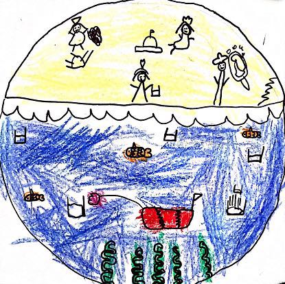 在向大家介紹這幅畫時,她寫到“我在三亞的時候,在沙灘上玩的很開心。沙灘上有很多人,深海里有很多的魚,它們不小心就會吃掉很多垃圾死掉,都是沙灘上玩的人扔的。我希望有一個深海潛水垃圾艇,它可以把所有垃圾吸走,這樣小魚就不會死了。”