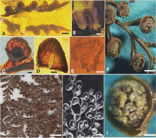 ——白堊密錐蕨化石(A-E)與現存密錐蕨(F-I)
