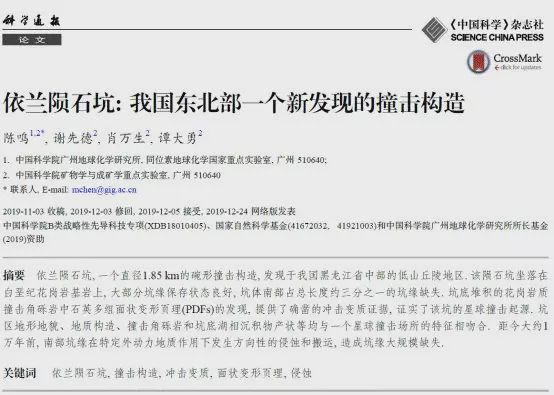 廣州地球化學(xué)研究所陳鳴研究員等人的論文:依蘭隕石坑:我國東北部一個新發(fā)現(xiàn)的