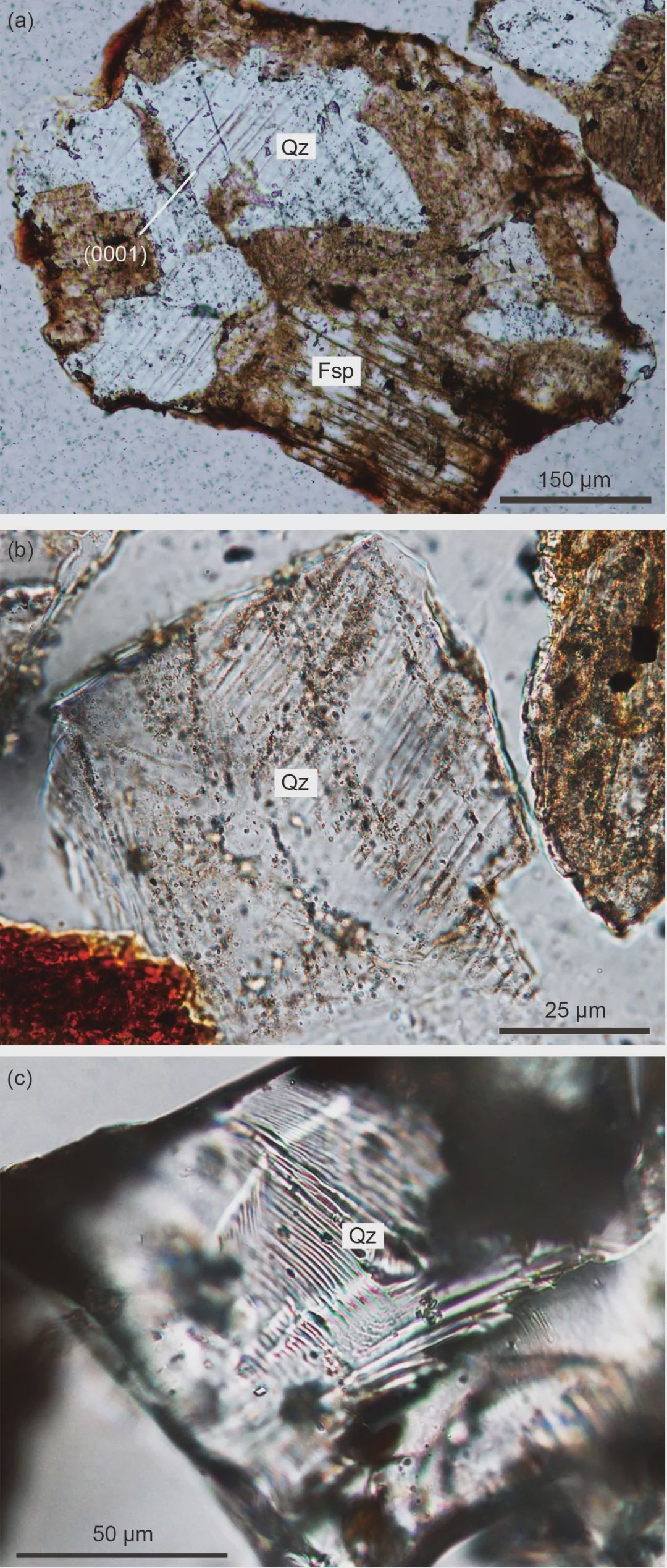 (a)花崗巖碎屑中石英發(fā)育一組平行于(0001)PDFs(NE-SW方向),單偏光;(b)石英晶體碎片含2組PDFs(分別為北東-南西和北北西-南南東方向),單偏光;(c)石英晶體碎片含3組PDFs(分別為北西-南東、北-南和北東東-南西西方向)的石英,單偏光;圖中的符號Qz代表石英,F(xiàn)sp代表長石(圖片引自:陳鳴等. 科學(xué)通報,2019)