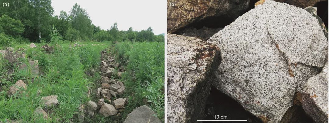 (a)隕石坑底部人工溝槽揭露土壤薄層之下的花崗巖角礫堆積,溝槽深度60cm,溝槽距離坑體內(nèi)壁約為100m;(b)新鮮的花崗巖角礫(圖片引自:陳鳴等. 科學(xué)通報,2019)