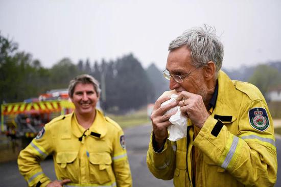 2020年1月,消防隊員趁著氣溫略微下降的間隙進食休息。