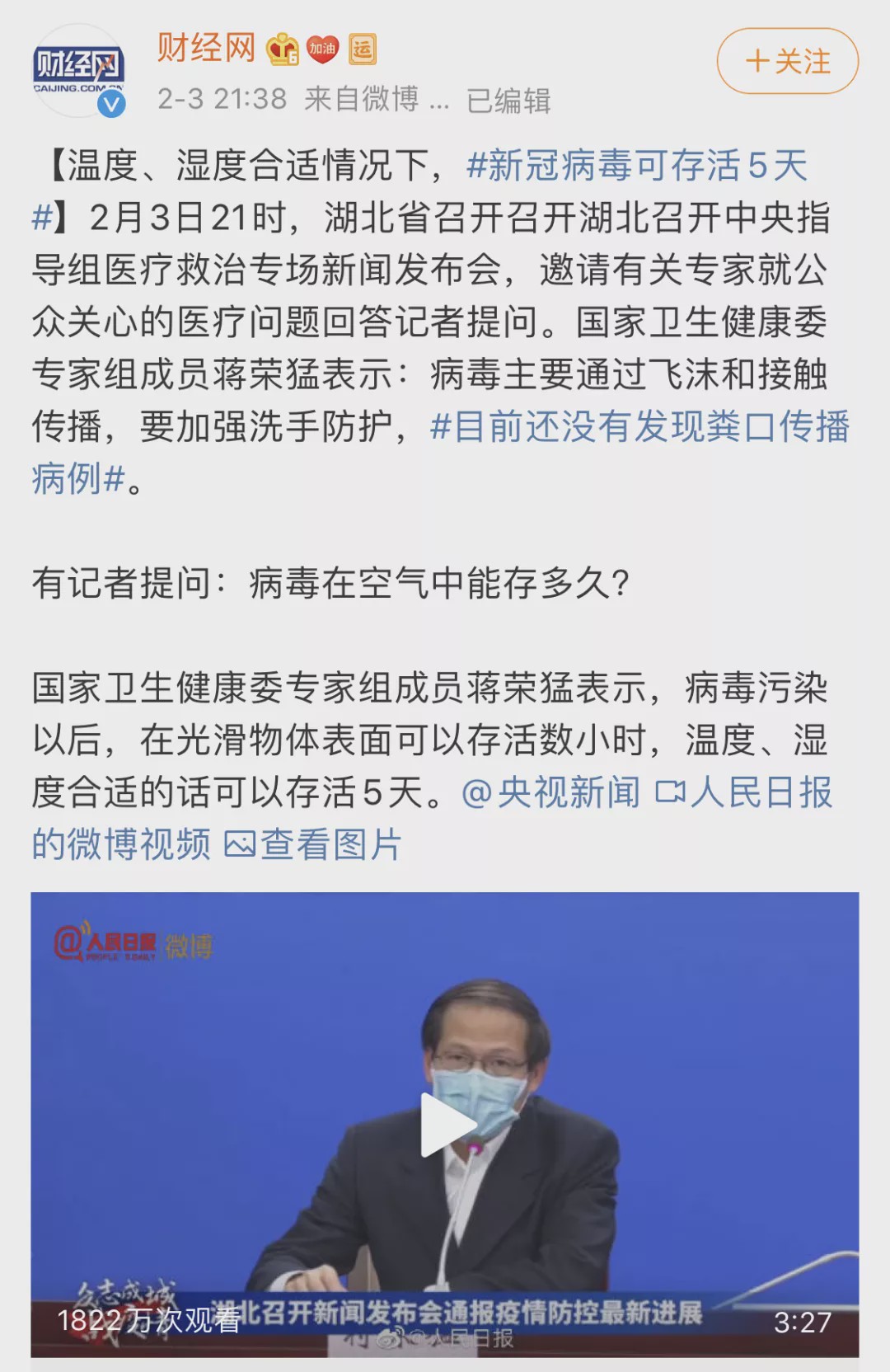 國家衛(wèi)健委專家針對這個(gè)問題專門做了解釋,說溫度濕度適宜的情況下,病毒體外可存活五天,這不是一個(gè)樂觀的消息。