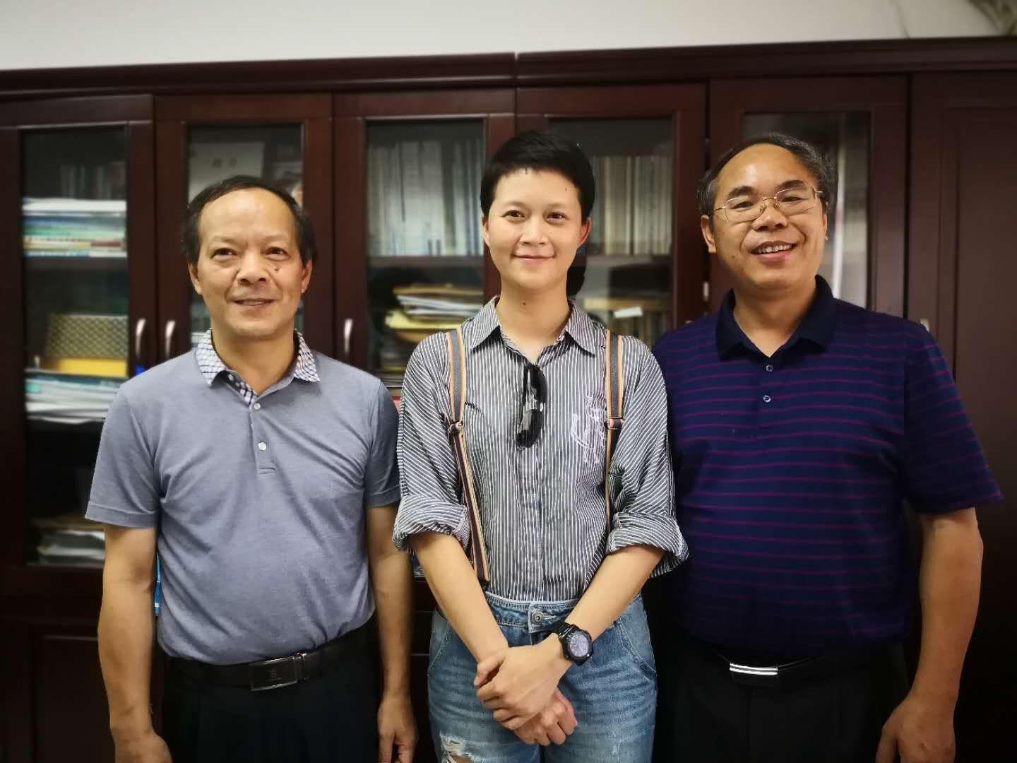 2018年6月29日,韋慧曉回母校,跟導師陳炳輝教授(左)和地球科學與工程學院院長王岳軍教授(右)合影。