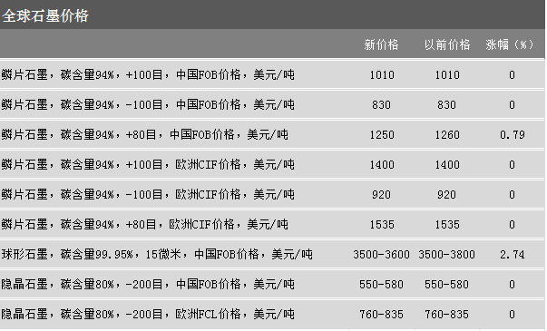 固定碳含量94%的中國鱗片石墨(-100目)價格為830美元/噸,歐洲同樣品級和大小的鱗片石墨售價為920美元/噸。