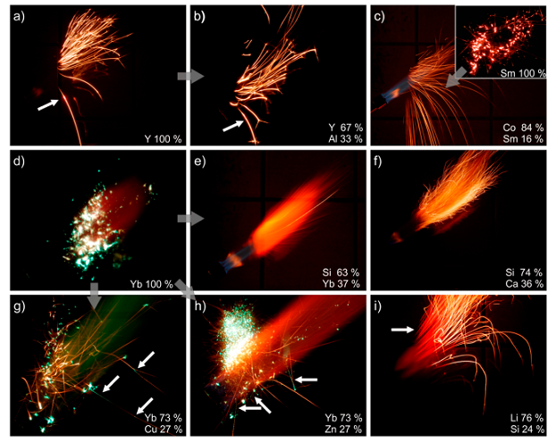 據Mining.com網站報道,美國化學會《ACS Omega》期刊最近刊登的一篇論文提出,利用稀土金屬合金粉末能夠產生從金黃色變為綠色并連續分叉的火焰。 本文通訊作者艾克·胡布納(Eike Hübner)稱,鉺粉末燃燒能夠產生一種顏色變幻,即從黃白色到亮綠色的火花。不過,綠色出現僅是一瞬間,不容易被覺察到。 焰火瀑布(Sparkler fountains)另外一個有趣的方面是其火花分支。為達到這個效果,商用焰火通常含有鐵碳粉末,但是金屬-金屬合金也可以做到這一點。因此,胡布納及其團隊希望能夠驗證是否稀土金屬-金屬合金能夠用來生產新型顏色變換或分支焰火。