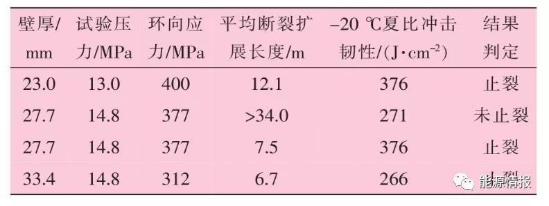 在俄方的試驗(yàn)方案設(shè)計(jì)中,試驗(yàn)段由中間一根起裂管、兩側(cè)各三根試驗(yàn)管和外側(cè)各一段70m長儲(chǔ)氣管段組成。主要采集的數(shù)據(jù)包括裂紋長度、裂紋擴(kuò)展速度等。由于不是采用天然氣而是采用空氣進(jìn)行爆破試驗(yàn),采用了不高于-20℃的試驗(yàn)溫度,以及相當(dāng)于1.25~1.5倍工作壓力的試驗(yàn)壓力,以期抵消采用空氣作為試驗(yàn)介質(zhì)的影響,從而獲得較為保守的試驗(yàn)數(shù)據(jù)。其中一次成功止裂的情況如上圖所示,典型試驗(yàn)數(shù)據(jù)見下表。