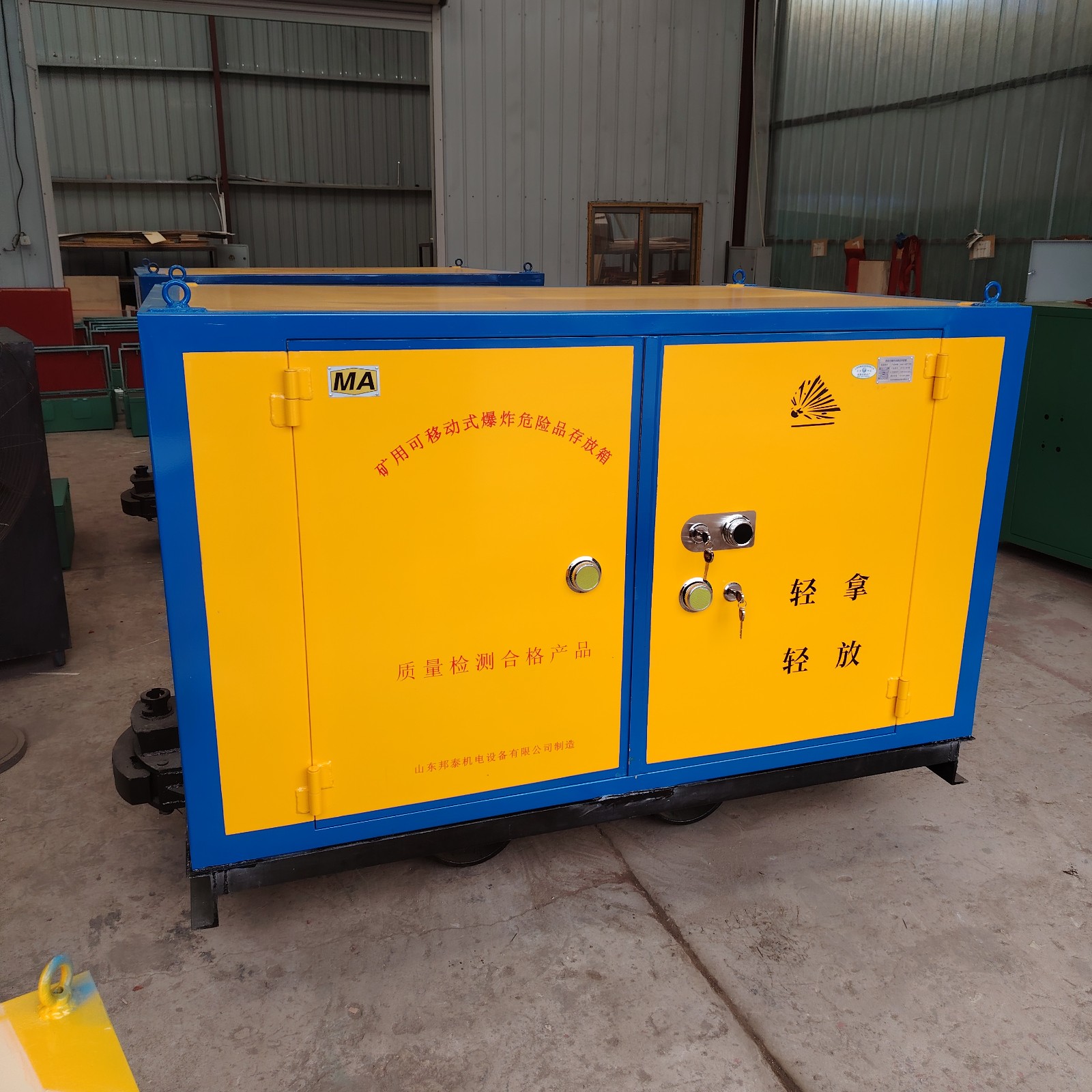 上半部分為外置6-8個(gè)厚的防爆鋼板,內(nèi)置10個(gè)厚的絕緣木板及2個(gè)厚的防火防震防靜電的阻燃?jí)|組成的礦用爆破箱;下半部分為可供600軌距、762軌距、900軌距軌道使用的材料車。
