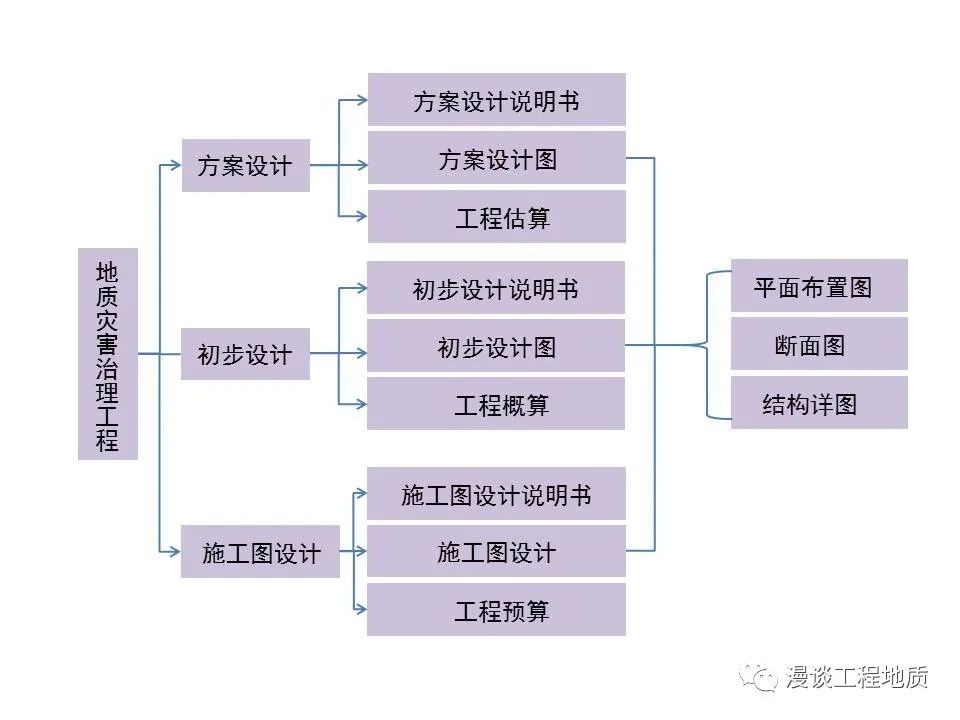 地質災害治理工程一般可分為可行性研究(方案設計)、初步設計和施工圖設計三個階段(三大設計階段);對于規模較小、類型簡單的地質災害治理工程,經有關主管部門同意,可在方案設計審批后直接進入施工圖設計。