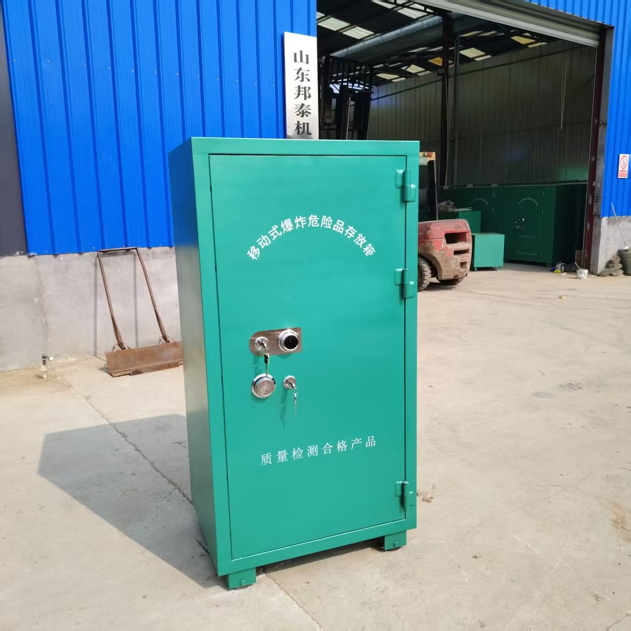 山東邦泰集團所生產銷售的鋼板材質保管箱可依照其功能存放危險物品。該產品箱體外置1.0mm厚防爆鋼板,內置7mm厚防靜電木板及1.0mm厚防靜電阻燃氈。 防爆箱鎖具配有三位防盜機械密碼鎖與兩個不銹鋼明鎖扣,是標準雙鎖配置,符合公安檢驗標準。同時箱體四角嵌有不銹鋼防撞包角,確保箱體更加堅固、抗撞擊。防爆箱配有提手并加裝聚氨酯背帶以便作業員實現手提、肩背,便于其更加高效工作。