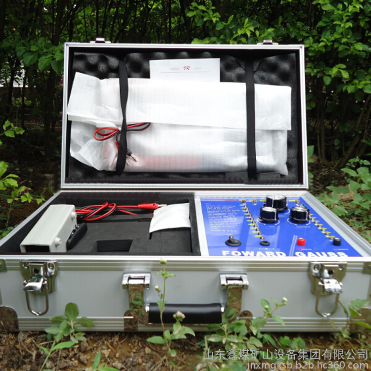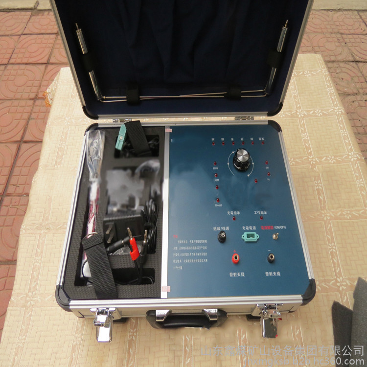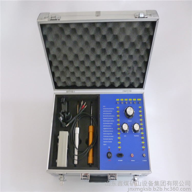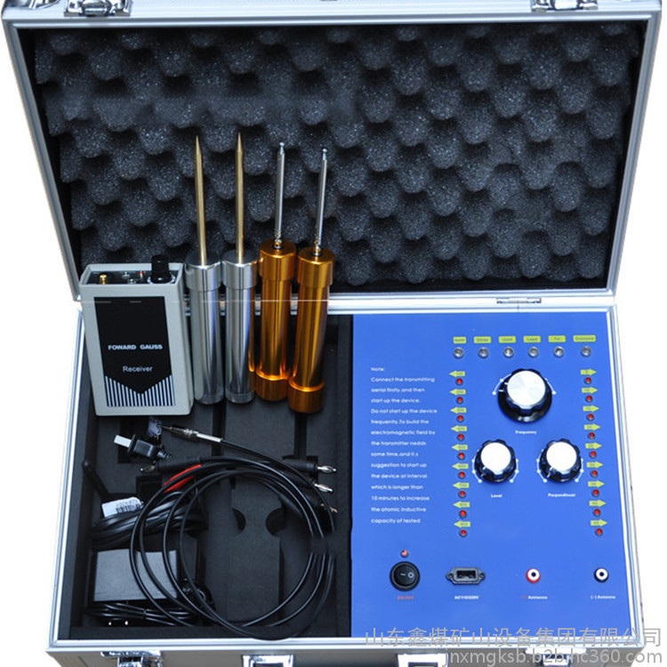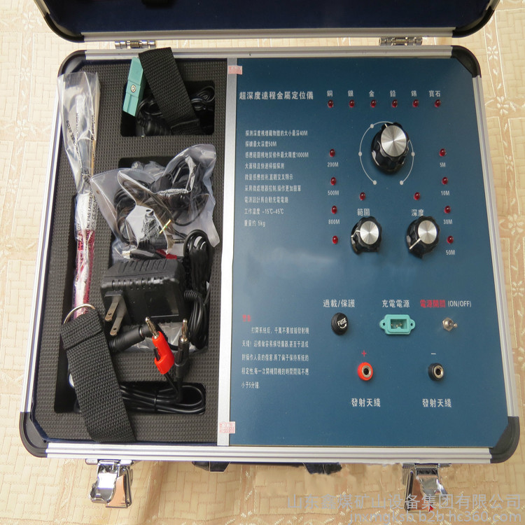 一個鑲有鋁邊并帶有把手和兩把鎖的黑色盒子,該盒子里裝有發射器和其它附件。該發射器是安裝在盒子里,發射器的面板上有六個LED頻率指示燈,且每個指示燈都代表某項功能,字母C開頭的表示銅,字母S開頭的表示銀,字母G開頭的表示金,字母L開頭的表示鉛,字母T開頭的表示錫,字母D開頭的表示寶石。在指示燈的下面有個頻率選擇開關,可以自由調節您所需要探測的金屬種類。頻率選擇開關的下面,有兩個旋鈕,分別標有"水平"、"垂直"字樣,分別代表探測深度與范圍。左右各有一豎排十個指示燈,可以用水平或者垂直鈕來調節您所要選擇的探測深度和探測范圍(探測深度為5-50M,每5M一個指示燈共計十個,探測范圍為100-1500M,每100M一個指示燈共計十個)。主機面板最下方一排從左起為電源總開關,電源充電孔,以及一紅一黑的兩個發射天線插孔。充電電路已經被設計在儀器內部,電池安裝在儀器中部的面板下面。(切記:充電時請先用大陸公司贈送的220V轉110V的轉換器插入家用電插座然后將充電器接插在轉換器上)