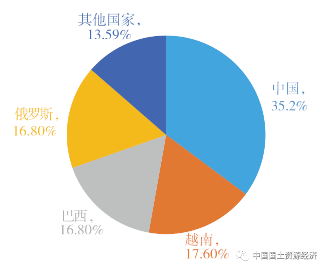 根據美國地質調查局(USGS)的數據,2021年全球稀土資源總儲量約1.2億噸,中國的儲量為4400萬噸,約占全球總量的35.2%(圖2);從稀土礦產量看, 2021年全球稀土產量為28萬噸,中國的產量為16.8萬噸,占全球總產量的60%。