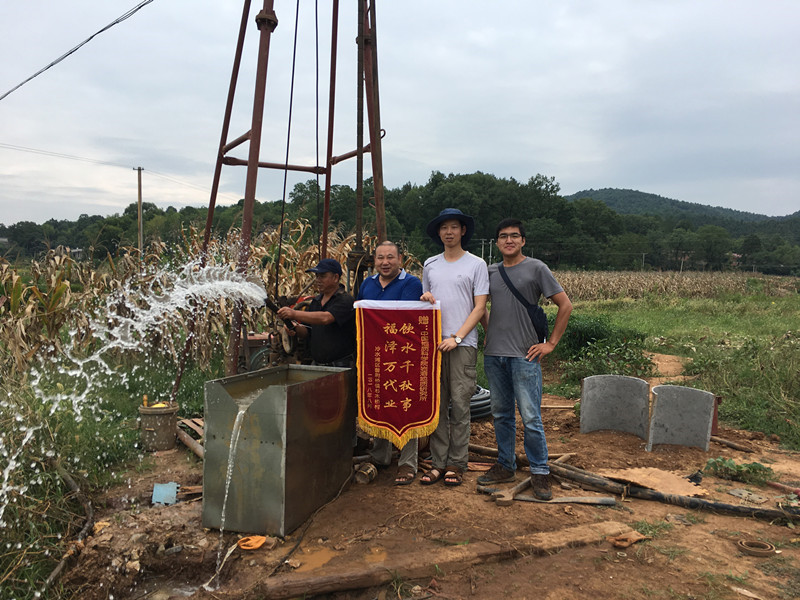 4口井分別位于冷水灘區楊村甸鄉沙子坳村、花橋街鎮坪塘村、普利橋鎮杉木橋村、祁陽縣文明鋪鎮大泉灣村,幾個村均處于衡紹干旱走廊分布區,生活飲用水問題一直很突出。其中普利橋鎮衫木橋村為國家級脫貧示范村,地形地貌屬于巖溶丘陵谷地,谷地寬300-400米,底部較平緩,山坡坡度20-30度,底部覆蓋的第四系土層厚度3-6米,地層巖性為泥盆系錫礦山組碳酸鹽巖,地層展布、節理裂隙發育程度主要受北北東向區域性斷裂的控制。盡管國家有關部門已做有前期配套設計規劃,但該村現有村民目前飲用水還是以自挖手提井為主,飲用水主要取淺層地表松散層孔隙水,飲用水的水量、水質均得不到有效保障,非常不利于國家級脫貧示范村的建設。野外項目組結合地方需求以及對該村水文地質條件、地質構造的分析,成功實施一口探采結合孔,孔深110米,涌水量為482.6方/天,可為該村5000余人提供水源保障。