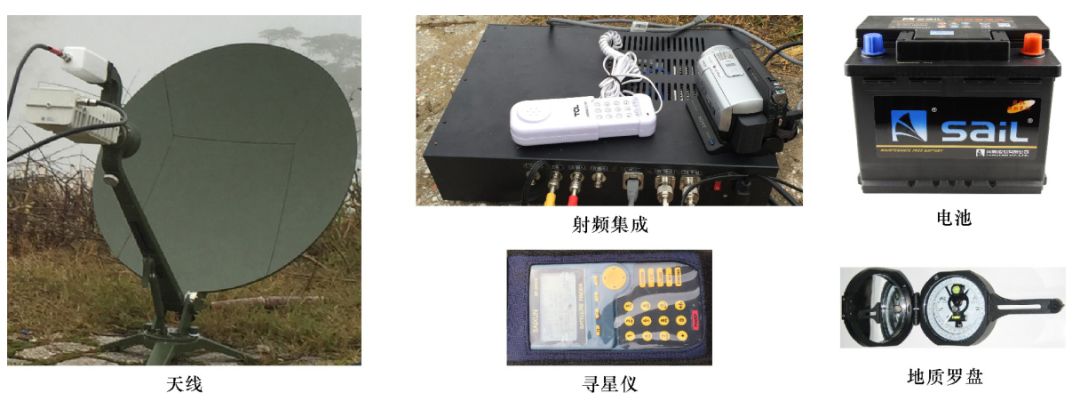 該系統(tǒng)設計為背包式便攜終端,即整個系統(tǒng)放置于一個背包中,包含天線、射頻集成、Modem等所有通信功能的設備,以及野外應急數據采集及傳輸所需的核心設備,即衛(wèi)星通信基帶單元、數據處理單元等,可完全滿足野外數據采集傳輸的基本功能。其他設備包括攝像機、電話、尋星儀、地質羅盤和供電設備等,如圖一所示。
