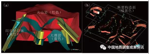(4)建立了雙尖子山和白音諾爾礦區(qū)三維地質(zhì)模型和研究區(qū)區(qū)域地質(zhì)框架模型。以主要賦礦地質(zhì)體和成礦地質(zhì)體為建模單元,建立了雙尖子山礦區(qū)(圖2)和白音諾爾礦區(qū)(圖3-a)三維地質(zhì)模型,另外,建立了研究區(qū)區(qū)域地質(zhì)框架模型(圖3-b),為深部找礦和勘查提供地質(zhì)和物性信息。