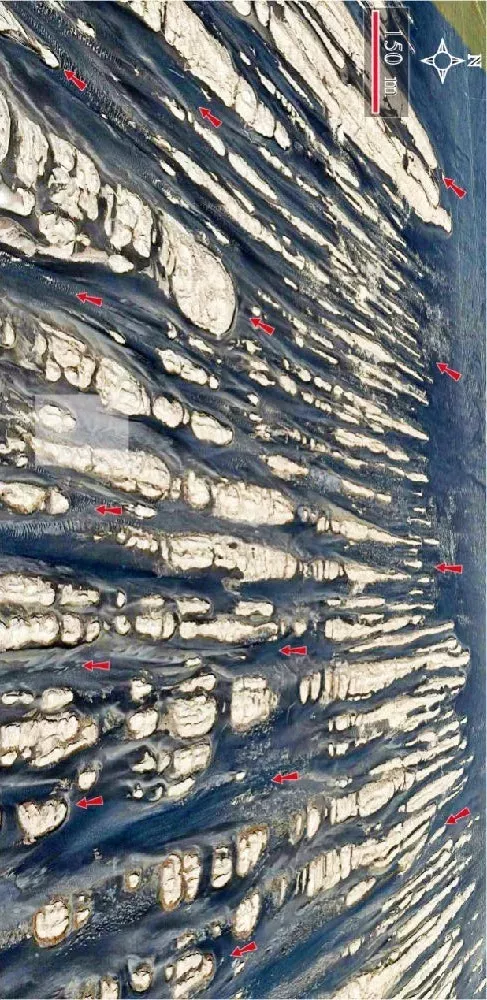 通過谷歌地球(GoogleEarth)從空中俯瞰,一排排風(fēng)蝕壟脊恰似大海中的艦隊,又似巨型的鯨群,你爭我趕地向前行進(jìn),蔚為壯觀(圖1)。受構(gòu)造作用、巖石的原始成份以及風(fēng)蝕作用和間歇性流水作用的共同影響,宏觀上的壟脊常呈不規(guī)則狀斷開,在風(fēng)沙的長期吹蝕和磨蝕下形成形態(tài)不同的地貌景觀,有的如潛艇,有的像蝌蚪,有的像獅子,有的像孔雀,有的像柱子,有的像蘑菇,千奇百怪。