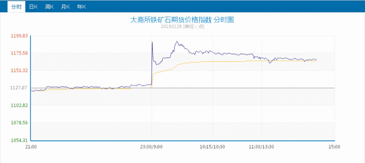 受該事故影響,在美上市的淡水河谷25日股價收跌8.08%,報13.66美元/股,盤中一度跌至12.85美元/股,創1月3日以來盤中最低。而期貨方面,受礦難引發擔憂,新加坡交易所鐵礦石指數期貨1月26日凌晨已大漲近4%。1月28日,大連商品交易所鐵礦石期貨主力合約開盤即快速上漲,盤中一度觸及漲停(如下圖)。