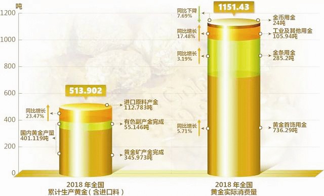 2018年,全國黃金實際消費量1151.43噸,連續6年保持全球第一位,與2017年相比增長5.73%。其中:黃金首飾736.29噸,同比增長5.71%;金條285.20噸,同比增長3.19%;金幣24.00噸,同比下降7.69%;工業及其他105.94噸,同比增長17.48%。國內黃金消費市場持續回暖,首飾和金條、工業及其他用金繼續穩定增長,金幣銷售略有下降。