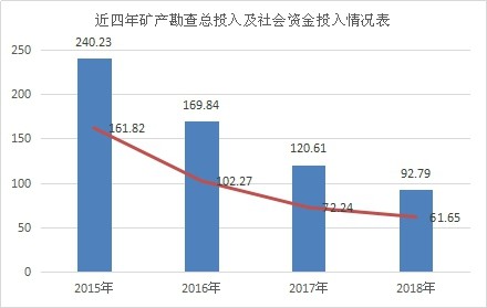 ——近四年來,國內(nèi)非油氣勘查投資下降明顯。從總體上來看,2018年非油氣勘查投入與2015年相比,減少了147.44億元,降幅達(dá)61.37%;單獨(dú)從社會資金投入來看,2018年與2015年相比,減少了100.17億元,降幅高達(dá)61.9%。社會資金的降幅高于勘查投入的整體下降幅度,這說明社會投資者的敏感度較高。