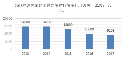 2013年~2017年采礦業(yè)固定資產(chǎn)投資變化(數(shù)據(jù)來自《中國礦產(chǎn)資源報(bào)告》)
