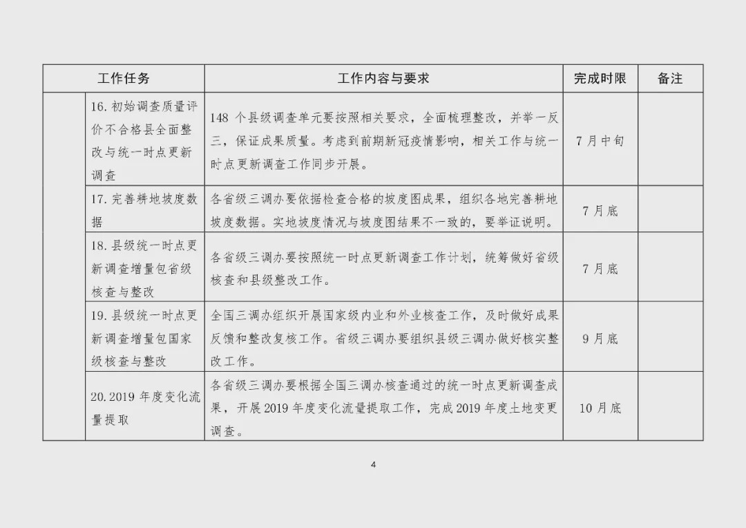 各級三調辦要按照《國務院第三次全國國土調查領導小組辦公室關于開展第三次全國國土調查統一時點更新調查的通知》(國土調查辦發〔2019〕24號)明確的任務、流程和要求,扎實做好統一時點更新調查各項工作?紤]到前段時期新冠肺炎疫情的影響,“三調”統一時點更新調查各項任務既定進度向后順延3個半月。