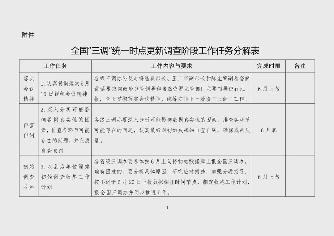 各級三調辦要對照《全國“三調”統一時點更新調查階段工作任務分解表》(見附件),逐縣逐項明確工作內容、目標要求和完成時限,建立清單、任務到人,對賬銷號、責任到人。各省級三調辦要根據各縣級調查單元工作的實際進度,壓茬推進初始調查收尾與統一時點更新調查,統一時點更新調查與其前后兩輪督察、督察整改到位與全省舉一反三整改到位的工作要有機配合與無縫銜接。
