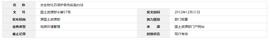 《古生物化石保護條例實施辦法》已經2012年12月11日國土資源部第4次部務會議通過,現予以發布,自2013年3月1日起施行。