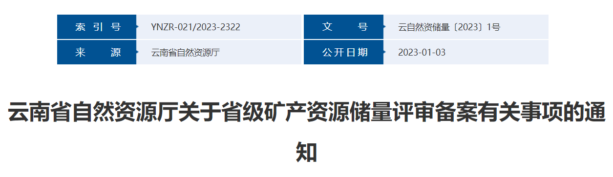 文章來源于:云南省自然資源廳,原文鏈接:云南省自然資源廳關于省級礦產資源儲量評審備案有關事項的通知