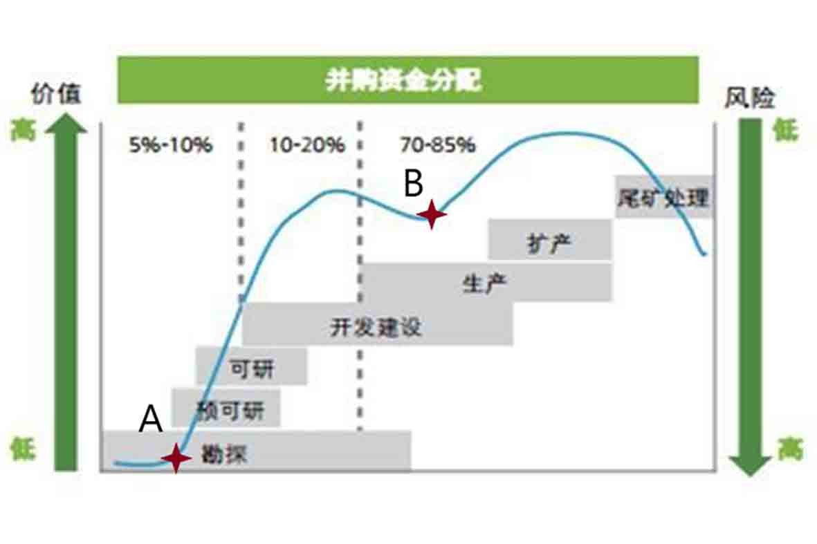 全球平均每1000個勘探項目,最終結果可能只有一個項目能成為一個可持續生產的礦,因此單從礦業項目來看,從礦業勘探發展至投產,一路風險很高。但是,投資礦業上市公司,投資人無需等到投產才收回資金。在合適時候投,投資成功了回報10倍~100倍也是正常的。那么,對礦業投資,什么時候投回報率高?答案應該在A點和B點(見圖1)。