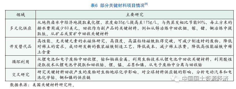 美國通過制定鼓勵政策、設計頂層戰略與計劃,依托愛達荷州、橡樹嶺、阿貢等國家實驗室,以及高校、研究機構和企業,資助基礎科學、技術開發、關鍵礦產和材料的試驗和小規模生產(如從煤和煤副產品等非常規來源生產稀土),拓展關鍵礦產的供應來源。推進回收技術研發,提高從廢物和廢料中回收材料的水平,促進關鍵礦產和材料的回收再利用。研發使用少量稀缺材料的替代材料和產品,開發具有較低供應風險的替代材料,緩解未來關鍵礦產和材料供應鏈的風險。
