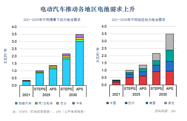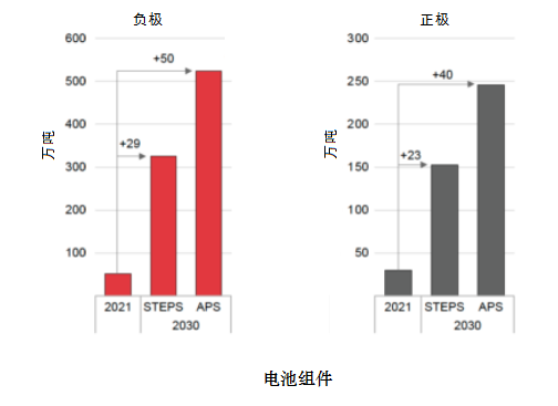 預測的2020年代末礦產供應量與IEA關于世界能源模型“既定政策情景”(STEPS,Stated Policies Scenario)下的動力電池需求量一致。但是一些礦產比如鋰的供應量到2030年需要增長1/3才能滿足同一能源模型中“公開承諾情景”(APS,Announced Pledges Scenarion)下動力電池的需求。