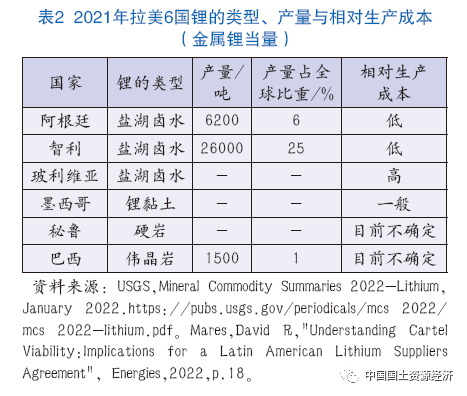鋰礦產(chǎn)量具有很強的動態(tài)性,基礎設施、開采技術和難度等差異都會影響鋰礦開采能力,擁有鋰礦床并不意味可以自動轉化為參與鋰市場供應的能力,因此鋰資源量與產(chǎn)量不成正比,其中起決定性作用的是鋰礦開采難度系數(shù)。根據(jù)表2,拉美6國的鋰礦主要以鹽湖鹵水鋰為主,基于地質開采狀況和基礎設施情況,阿根廷的鋰礦生產(chǎn)成本最低,是鋰礦分布最為密集的地區(qū)之一。其次是智利,其礦床擁有全球最高的鋰濃度,鋰含量達到1000毫克/升以上,鎂鋰比為1∶3,是玻利維亞礦床鋰含量的3倍。玻利維亞鋰資源量較高,但由于其鹽水中含有大量雜質,而且蒸發(fā)過程常被降雨打斷,加之基礎設施和生產(chǎn)技術較為落后,產(chǎn)量較為低下,因此,玻利維亞與墨西哥、秘魯一同被美國地質局列為儲量不確定的國家,商業(yè)化開發(fā)程度較低。盡管如此,目前玻利維亞國家鋰業(yè)公司(YLB)的碳酸鋰生產(chǎn)已經(jīng)進入試驗階段,2022年1—11月碳酸鋰出口量達到600噸,預計當工廠滿負荷運行時,每年產(chǎn)量將達到上萬噸。墨西哥的礦床是黏土性鋰礦,濃度要低于鹽水型鋰礦,因此開采成本相對較高,生產(chǎn)中不確定性因素很多。2019年,墨西哥索諾拉州發(fā)現(xiàn)鋰礦床,并宣稱這一礦床可能是全球最大的鋰礦床之一,有2.43億噸鋰資源,潛力巨大。1979年至今,在墨西哥已經(jīng)至少發(fā)現(xiàn)57個含鋰地點,但由于生產(chǎn)集中度低,目前只有數(shù)10個鋰礦床可開采,仍然處于外國公司的勘探和開發(fā)初期。