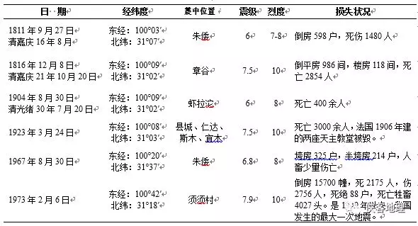爐霍200年來地震及災害簡表