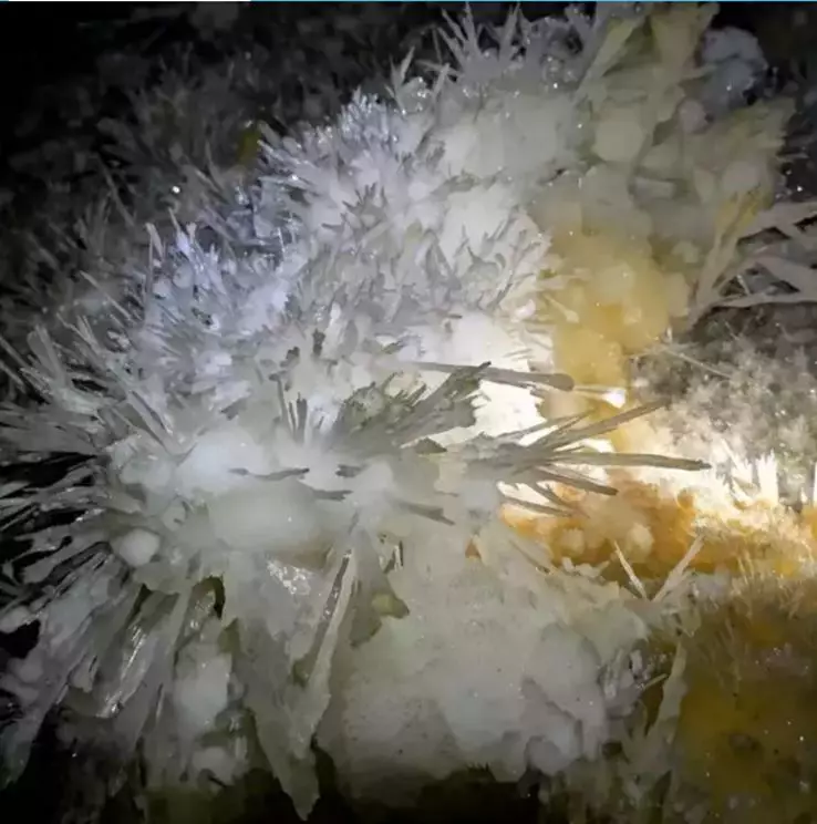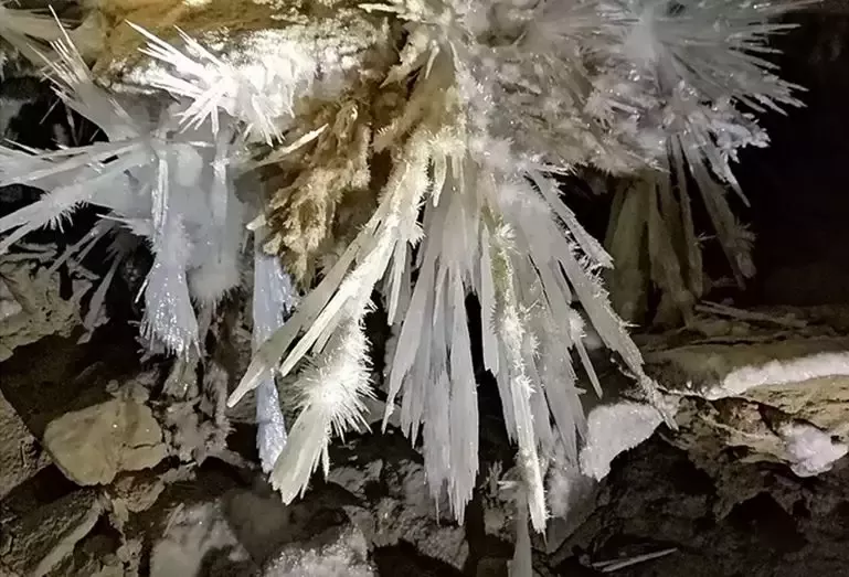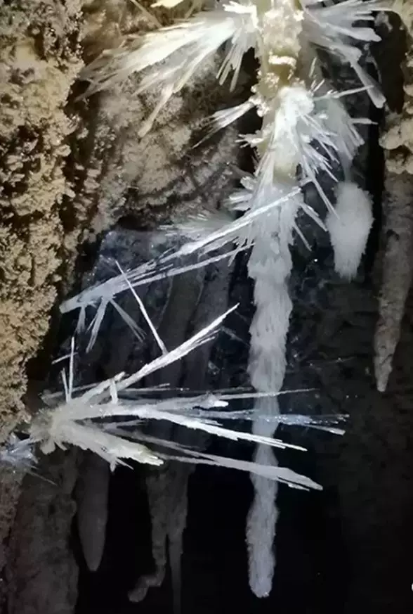 銅仁晶洞宮位于貴州省銅仁市九龍洞溫泉附近的錦江左岸,系2018年4月修建渝懷鐵路復線時偶然發現,近日在網上曝光,頓成網紅。專家實地考察,晶洞宮已勘察兩層洞道,上層約600米,下層約100米;鶐r地層應為寒武系白云巖,晶體類型多樣,琳瑯滿目,千姿百態。主要發育文石、方解石、石膏三大類晶體,分布面積約1500平方米。晶體形態有球狀、花狀、枝狀、絮狀、針狀、管狀、柱狀、放射狀、卷曲狀、幕簾狀等十余種,令人驚艷,為國內少見。現根據網上資料,從旅游地學科普與審美角度,初步歸納、整理如下,供大家分享。