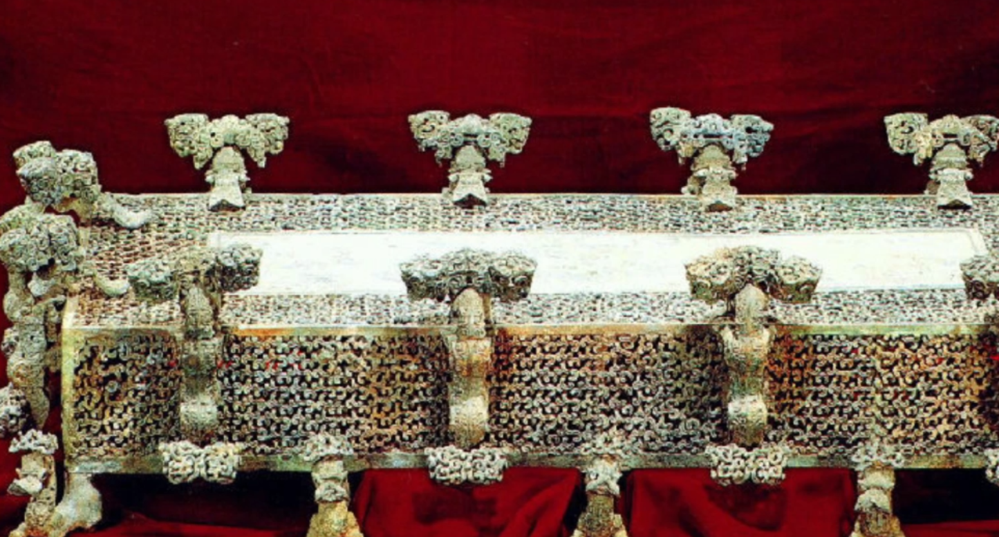 這座古墓是春秋時(shí)期楚國的一座大墓,古墓中連續(xù)出土了數(shù)千件陪葬品,由此可以斷定墓主人一定是達(dá)官顯貴。后來,經(jīng)專家分析,這是楚國君主楚莊王的墓葬。這些陪葬品中最為珍貴的要數(shù)一件叫云紋銅禁的物品。云紋銅禁是用青銅鑄成,整體長一米,寬半米,高約30厘米,是楚國用來祭祀的一件禮器。目前全國一共出土了七件云紋銅禁,而河南出土的這一件是制作最為精美,規(guī)格最大的。