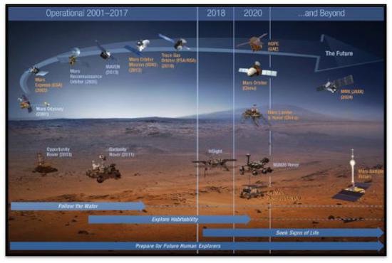 從上面的圖中可以看到,圍繞著水的尋找,人類從環繞器的三個探測器加上“機遇號”火星車,開展了很多研究工作。圍繞著可居住性發射了軌道探測器、微量氣體探測器以及“好奇號”火星車,進行了各種探測活動。最近一次人類成功在火星上降落的是“洞察號”火星著陸器,它是研究磁場和大氣是怎樣的情況、多久消失的,另外還要進行類地行星的研究。