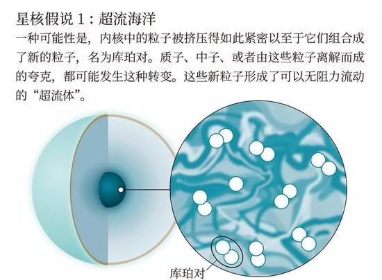 這種流體具體是什么形式的,仍是個沒有定論的問題。一種可能是,夸克形成了“超流體”,這樣的流體沒有黏性,理論上一旦運動起來就永遠不會停下來。中子星內部出現這種離奇的物質狀態是可能的,因為夸克之間的關聯性使得它們在足夠靠近時可能形成束縛的“庫珀對”。