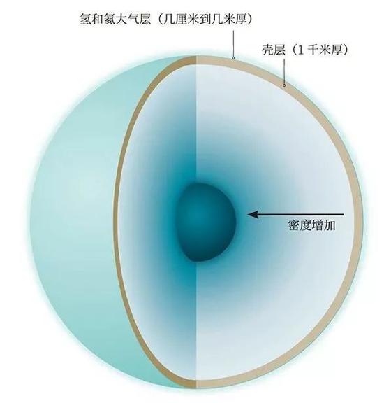 物理學家認為,中子星的質量大約是太陽的1~2.5倍,可能有至少三層結構。最外層是由氫和氦組成的氣態“大氣”,厚度為幾厘米到幾米。這層大氣漂浮在厚度約1千米、由原子核構成的外“殼層”之上。在這一層中,原子核排列成晶格結構,電子和中子充斥于其間。最里面的第三層包含了中子星的大部分質量,其具體成分仍是個謎。這里的原子核擠在一起,幾乎沒有剩余空間,達到了核物理能允許的最高密度。越靠近中子星的核心,每個原子核內的中子數就越多。在某處,原子核將無法容納更多的中子,這時中子會溢出,此時再也沒有原子核了,只有核子(即質子和中子)。最終,在中子星最深處,這些粒子也可能被分解。