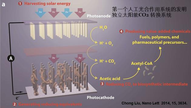 在2014年的時候,我們實驗室第一次把整個系統集成在一個體系當中,有兩個半導體、兩類催化劑。一個半導體做水氧化變成氧氣,另外一個引入生物催化劑,把二氧化碳變成了醋酸。這里面全反應是什么樣的?就是二氧化碳加上水加上太陽能,變成氧氣和醋酸,這是全反應。醋酸是非常簡單、但又非常重要的化學中間體。一旦有了醋酸以后,可以利用現在已有的工業技術,轉化成其他各種各樣的化學品,像汽油、高分子、藥的前驅體等。這是利用自然界中光合作用的全反應的原理學習,第一次在實驗室的模擬材料當中體現出來的。