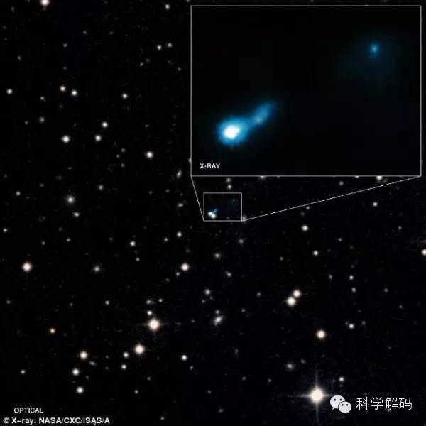 在這一時間點上,宇宙大約只有目前年齡的五分之一,而那時的殘留輻射比現(xiàn)在強烈得多。錢德拉望遠鏡發(fā)現(xiàn)的此次噴流是被宇宙中最古老的光照亮的。這道光出現(xiàn)于一個被稱為B3 0727+409的黑洞系統(tǒng)里,距離地球至少有30萬光年。