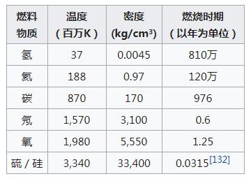7-10倍太陽質量以上的恒星最終命運都一樣,未來面臨的將是超新星爆發,所不同的只是它們經歷的過程,我們來了解下大質量恒星超新星爆發前的狀態,內核溫度夠高,元素可以從氫氦碳氧氖鎂硅硫鈣一路到鐵,此時鐵核再無可能聚變,因為鐵元素后的元素形成需要大量的結合能,而此時沒有輻射壓的支撐,外殼重力坍縮,超新星就此爆發,一次超新星爆發產生的能量超過10^46焦耳。