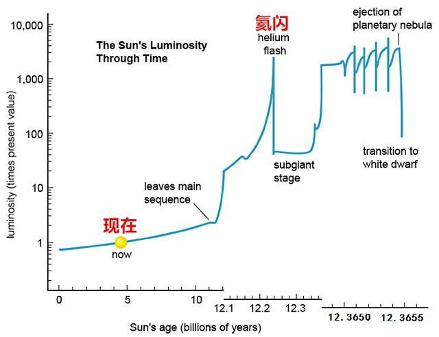 太陽的光度變化曲線,尖峰就是氦閃時代,第一次氦閃會在太陽脫離主序星12億年后發生,以后會越來越頻繁,一直到太陽的白矮星時代才會結束。