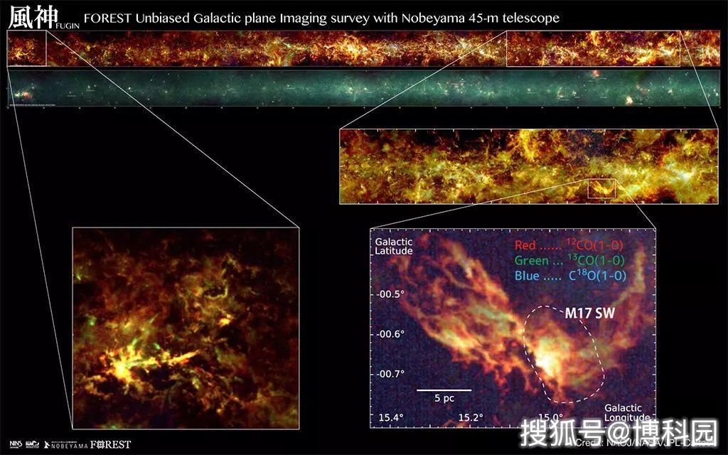 這些觀測資料具有高空間分辨率和大區(qū)域覆蓋。然而,這種觀測是困難的,因?yàn)楦呙芏葰怏w結(jié)構(gòu)比低密度氣體結(jié)構(gòu)小幾十倍。FUGIN利用NRO 45米望遠(yuǎn)鏡和多波束接收器FOREST進(jìn)行的銀河系勘測項(xiàng)目克服了這些困難。NAOJ的項(xiàng)目助理教授Kazufumi Torii和團(tuán)隊(duì)分析了FUGIN項(xiàng)目獲得的大數(shù)據(jù)。并測量了沿銀河系2萬光年范圍內(nèi)低密度和高密度氣體的精確質(zhì)量,首次發(fā)現(xiàn)高密度氣體只占總氣體的3%。這些結(jié)果表明,在低密度氣體云中高密度氣體的產(chǎn)生率很小,只創(chuàng)造了少數(shù)形成恒星的機(jī)會。