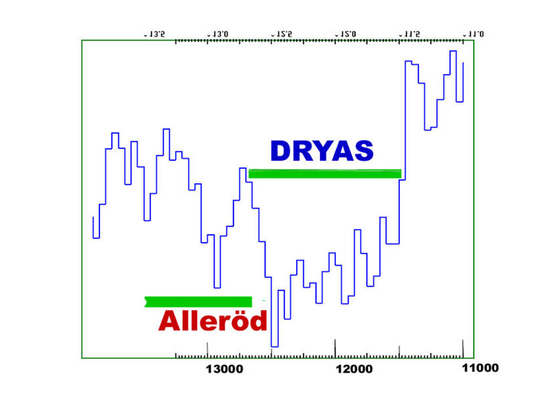 上面這張圖,就是通過測定冰芯中氧18同位素得到的溫度的結果,所以新仙女木事件的發(fā)生與終止都是異常劇烈的。