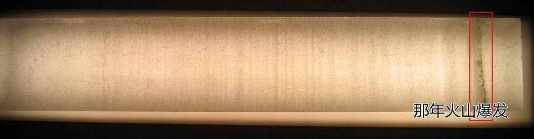 上面這張圖是一個冰柱的其中一段,我用紅色框出來的那部分是1870米深的其中一小段冰芯,框出來的那些是有明顯灰塵的,其實那些就是幾千年前冰島火山噴發(fā),在冰芯上留下的痕跡。