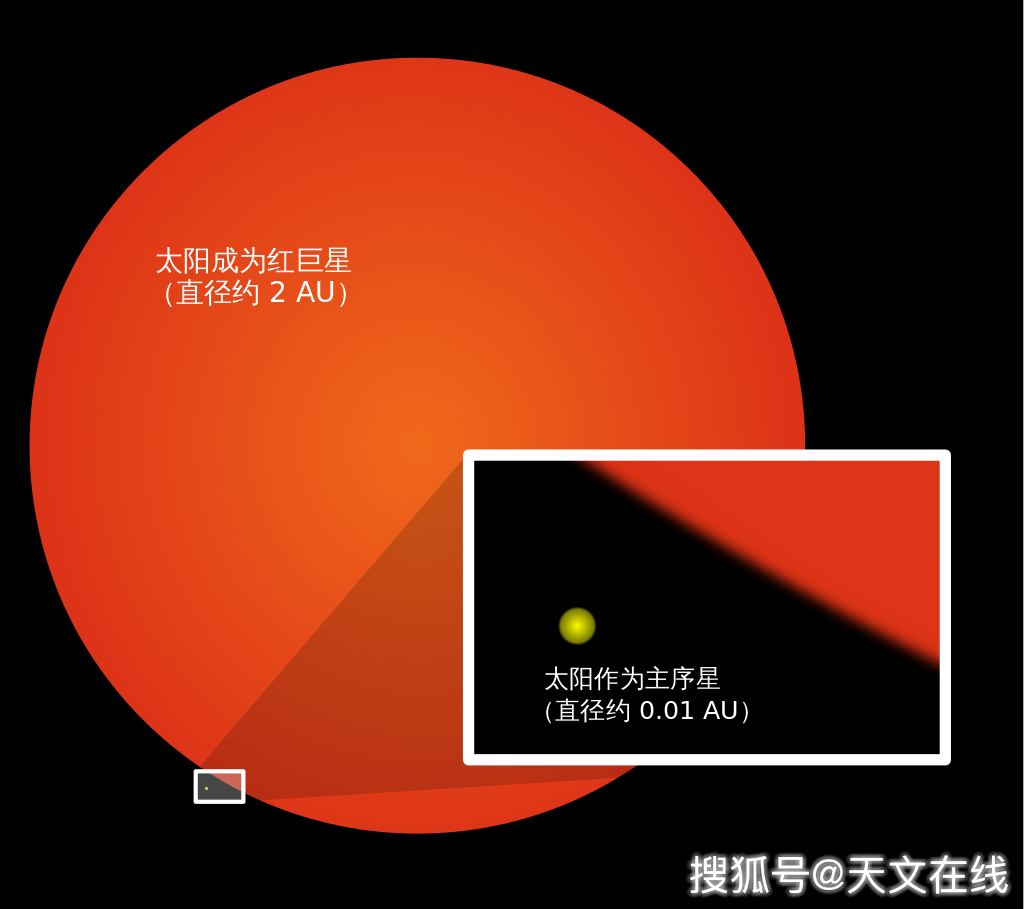 圖解:比較當前作為主序星的太陽和將來成為紅巨星的太陽。