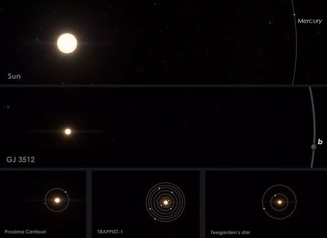 GJ 3512紅矮星系統(中)和太陽系(上)及其他部分紅矮星系統(下)的1:1對比圖。