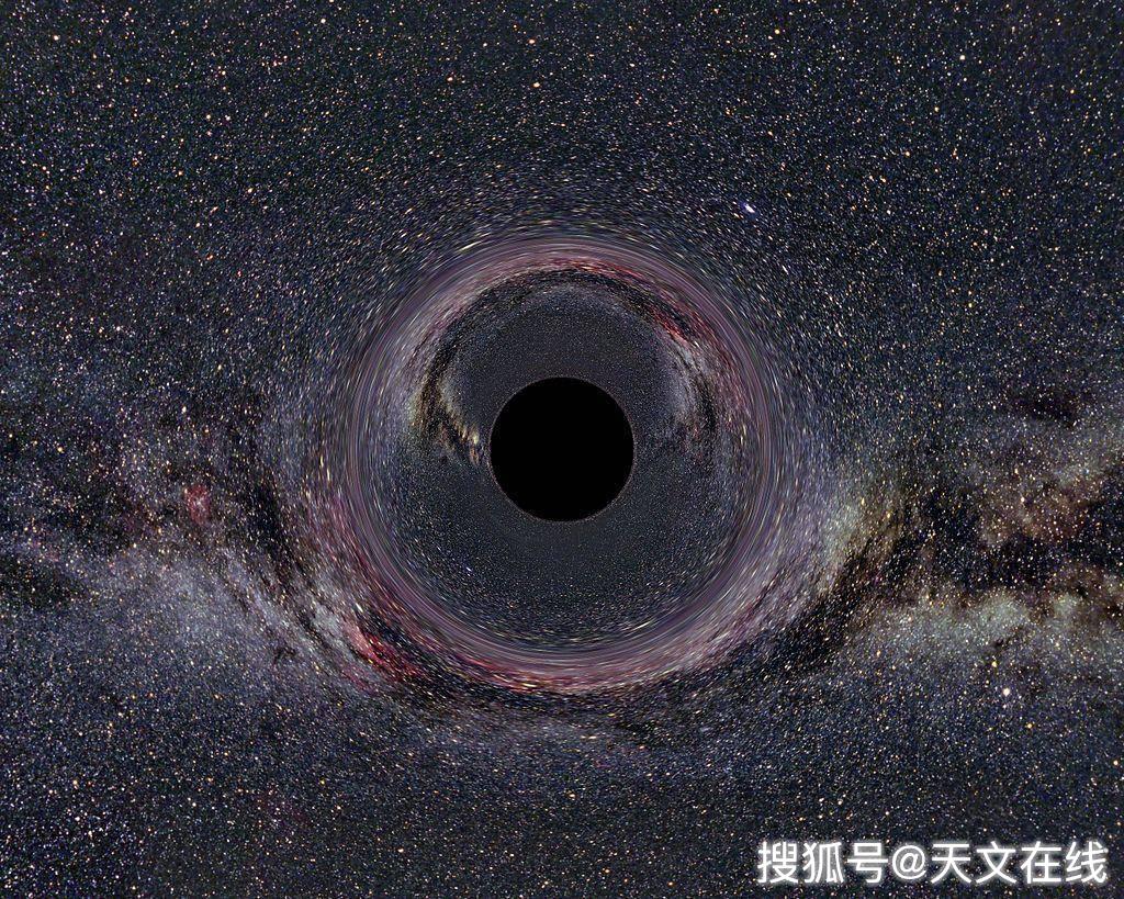 圖解:大麥哲倫云面前的黑洞(中心)的模擬視圖。請注意引力透鏡效應,從而產生兩個放大,以星云最高處扭曲的視野。銀河系星盤出現在頂部,扭曲成一個弧形。